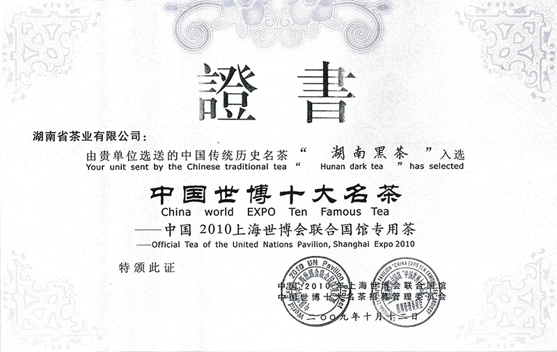 上海世博會(huì )中國世博十大名茶證書(shū)